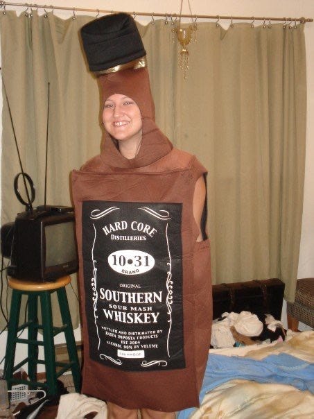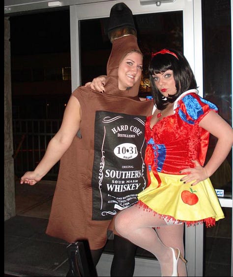 “Please! I beg of you. My friend wore the Jack Daniel’s bottle and let me have the cute costume, I can’t make her leave now. I won’t drink anything else, I promise!” I pleaded to Shrek.
