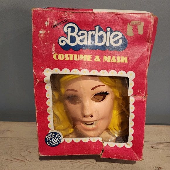 Every year as a child I went as some variation of “Fairy Princess.” It was the late eighties and my dream was to have a store bought Barbie costume, which consisted of a cheap polyester “satin” dress of some sort and a horrific looking plastic Barbie mask. The pink Barbie high heels would have to be purchased separately.